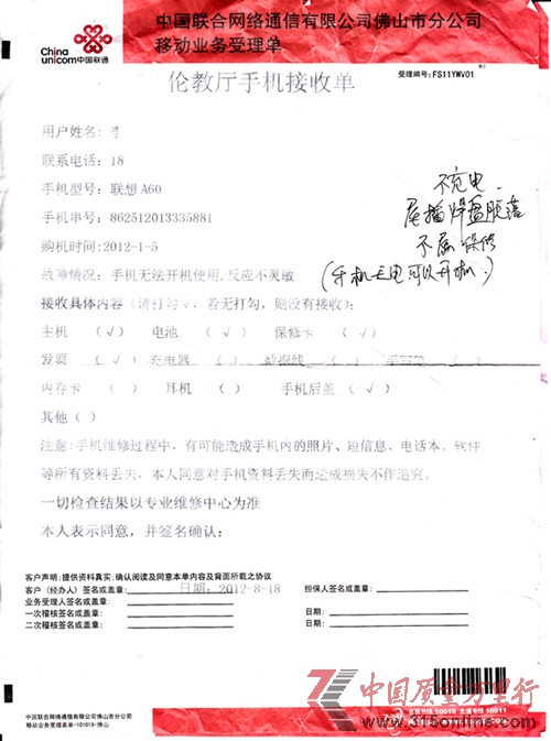 2012年1月5日在联通佛山顺德伦教营业厅购入一台联想A60手机,在2012年7月出现充电闪屏且经常自动关机的情况。后来去营业厅……【详细】