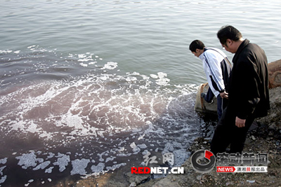 (2009年11月3日,长沙市环保部门的执法人员发现长沙毛巾集团公司排污口排出的污水还是有明显的色差。 图/潇湘晨报滚动新闻记者 殷建军)