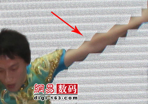 一名热心的网友向网易数码提供了一组他用佳能50D于6月30号拍摄的舞台照片并说明了问题所在。编辑将照片打开,可以明显看到该网友所说的现象。现象具体表现为:在电视墙前面的演员手臂呈现严重的锯齿状,有点类似“马赛克”。而且不是偶然现象,只要在电视墙前面的物体基本都会马赛克。点击进入图库分析更多原图。
