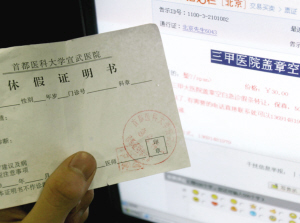 本报讯(实习生 肖岳 李秋萌)近日,一则出售北京三甲医院空白病假条的帖子出现在各大论坛。昨天,记者联系上发帖者,并从这名自称是“宣武医院医生”的男子手上购得盖章的空白休假证明书。宣武医院表示,证明书上的公章是伪造的。