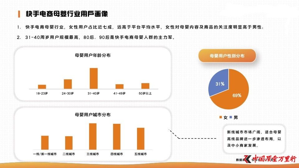 行业快速增长背后,快手电商母婴消费者呈现出鲜明特征:女性用户占比近七成,远高于平台平均水平;31-40周岁用户规模最高,80后、90后成为快手电商母婴人群的主力军;新线城市市场广阔,适合母婴高线品牌进一步渗透布局,以及中小商家发展。