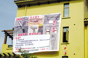 从外观上看,常州一个名为“西城·格兰艺堡”的小区是一个典型的欧式花园洋房,然而,近来,该小区一洋房的山墙上悬挂的巨幅海报着实吸引了不少当地过往市民的目光,该洋房的业主张先生在房屋出现诸多质量问题后与开发商交涉未果的情况下,只得出此下策,在自家房屋的山墙上悬挂了巨幅海报,海报上除了印有房屋内部细节的巨幅照片之外,还列举了整整五条该房屋的种种“毛病”,业主自称此房为常州最牛“豆腐渣”洋房,欢迎市民前来参观每面墙的裂缝以及漏水“精品”。
