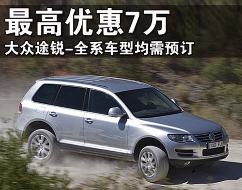 途锐是大众首款引进我国的SUV车型,在3.6L及4.2L率先上市后,大众为了满足消费者的更大胃口,紧接着又推出了搭载12缸发动机的 6.0L车型。随着大排量消费税的颁布,给9月份后入关的大排量车型带来了一次不小的冲击,令大排量汽车价格都上调了不少。近日据网上车市价格系统监测显示,大众途锐的6.0L车型已经停止进口,并且购买目前购车可以得到最高7万元的优惠,具体详情请看下表: