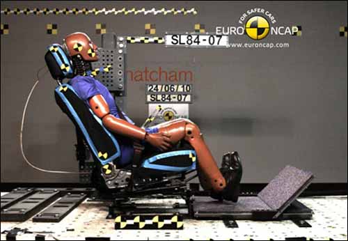 挥鞭效应测试:挥鞭效应引发的创伤大多发生在追尾事故中。前车的乘员头部剧烈向后甩动,颈部会受到挥鞭伤,其伤害持续时间长且易造成永久损伤。现在还不能够充分了解汽车内部结构导致挥鞭效应伤害的机理,不过其伤害程度与座椅和头枕的设计有很大的关系。EURO-NCAP使用模拟设备动态评估高、中、低三种不同强度的碰撞下,专用假人受到的伤害程度。